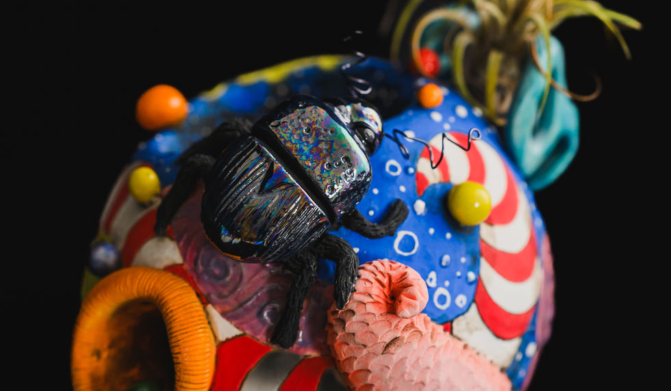 Meet "Lucky Tortoise," a whimsical yet profound ceramic creation that ventures beyond the ordinary, weaving a narrative of spirituality and symbolism. This handcrafted tortoise is more than just a charming addition to your space; it carries a deeper message inspired by the rich symbolism associated with the tortoise as a spiritual guide. As our planet faces the consequences of human actions, Lucky Tortoise prepares to depart, carrying a message of change and the readiness to move into a new cycle. Its suitcases symbolize not only a physical journey but also the freedom to embrace transformation whenever the need arises. Take a closer look at the carefully curated items adorning Lucky Tortoise. An abalone shell offers emotional balance and a connection to the water element, opening the doors to our unconscious mind, imagination, and intuition—a reminder of the importance of nurturing our spiritual selves. Nestled among these symbols are coins, representing longevity, prosperity, and abundance. They echo the safety and protection associated with the tortoise's self-contained shell, forming a spiritual protective aura that encourages inner exploration. The eyes fixed upon the tortoise grant it the ability to gaze within, embodying the wisdom that comes with age and experience. Adding another layer to this profound narrative, Lucky Tortoise carries vinyl records of traditional blues, featuring the soulful sounds of Nina Simone, Louis Armstrong, and Duke Ellington. These musical treasures invite reflection on the interconnectedness of art, culture, and the human spirit. Further enhancing the depth of this spiritual journey is James Joyce's "Ulysses," a literary masterpiece nestled within the tortoise's cargo. This work explores the psychological journey of its characters and delves into what happens when we lose our connection with the symbolic mother figure. Joyce's narrative serves as a poignant reminder of the impact that severing this primal bond can have on our lives. The absence of the mother figure has an impact on our sense of identity and leave us with a constant sense of longing and loss. In addition, Lucky Tortoise proudly carries a book on Greek mythology, a foundational source for understanding and making sense of the world. This ancient tapestry of stories and archetypes provides a timeless framework for exploring the complexities of human existence and our relationship with the divine. "Lucky Tortoise" is not just a sculpture; it's a poetic invitation to reflect on our relationship with the planet, the inevitability of change, and the wisdom that accompanies the passage of time. With a touch of humor and a rich tapestry of symbols, this ceramic creation encourages us to embark on our own spiritual journey, guided by the timeless wisdom woven into its form and the treasures it carries.